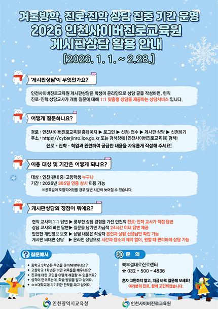ÀÎõ½Ã±³À°Ã» °ü°èÀÚ´Â ¡°»çÀ̹öÁø·Î±³À°¿ø °Ô½ÃÆÇ »ó´ãÀº ÇлýµéÀÌ È¥ÀÚ °í¹ÎÇϱ⠽¬¿î Áø·Î¡¤ÁøÇÐ ¹®Á¦¸¦ ÇöÁ÷ ±³»ç¿Í ÇÔ²² ÇØ°áÇÒ ¼ö Àִ â±¸¡±¶ó¸ç ¡°°Ü¿ï¹æÇÐ µ¿¾È ÇлýµéÀÌ ÀÚ½ÅÀÇ Áø·Î¸¦ Á¡°ËÇÏ°í »õ ÇгâÀ» ÁغñÇÏ´Â µ¥ ½ÇÁúÀûÀÎ µµ¿òÀÌ µÇ±æ ¹Ù¶õ´Ù¡±°í ¸»Çß´Ù.