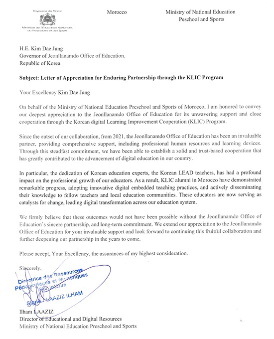 À̹ø °¨»ç ¼ÇÑÀº Àü³²±³À°Ã»ÀÌ 2021³âºÎÅÍ ÃßÁøÇØ ¿Â ±³À° Á¤º¸È Áö¿ø »ç¾÷(KLIC¡¤Korean Digital-Learning Improvement Cooperation)À» ÅëÇØ ¸ð·ÎÄÚ ±³À°ºÎ¿Í µðÁöÅÐ ±³À° ºÐ¾ß¿¡¼ Áö¼ÓÀûÀÎ Çù·ÂÀ» À̾î¿Â µ¥ ´ëÇÑ Æò°¡¸¦ ´ã°í ÀÖ´Ù. ¸ð·ÎÄÚ ±³À°ºÎ´Â ´Ü±âÀû Áö¿ø¿¡ ±×Ä¡Áö ¾Ê°í Àå±âÀû °üÁ¡¿¡¼ Çù·ÂÀ» À̾î¿Â Á¡¿¡ ´ëÇØ ±íÀº °¨»çÀÇ ¶æÀ» ÀüÇß´Ù.