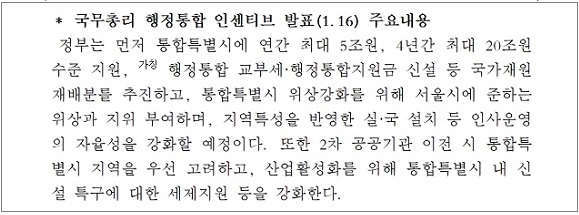 ´ë±¸½Ã´Â ÇàÁ¤ÅëÇÕÀÌ ´ë±¸¡¤°æºÏ ¹Î¡¤±º ÅëÇÕ°øÇ× °Ç¼³ µî ÇÙ½É Çö¾È ÇØ°áÀÇ µ¹ÆÄ±¸°¡ µÉ ¡®¹é³â´ë°è¡¯¶ó´Â ÀÔÀåÀÌ´Ù. ÀÌ¿¡ ÅëÇÕÆ¯º°½Ã Ãâ¹ü ÀÏÁ¤ÀÌ Ã˹ÚÇÑ Á¡À» °¨¾ÈÇØ ÇàÁ¤ÅëÇÕ Æ¯º°¹ý Á¦Á¤°ú ½Ãµµ¹Î °ø·Ðȸ¦ º´Çà ÃßÁøÇϰí, À¯°ü±â°ü°ú Áö¿ª Á¤Ä¡±Ç, °æºÏµµÀÇ Àû±ØÀûÀÎ ÇùÁ¶¸¦ ¿äûÇÒ °èȹÀÌ´Ù.