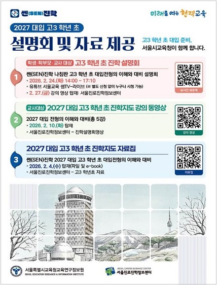 ¸ÕÀú¡¸½ë(SEN)ÁøÇÐ 2027 ´ëÀÔ °í3 Çгâ ÃÊ ÀÚ·áÁý¡¹À» Á¦ÀÛÇØ ¿À´Â 2¿ù 6ÀϱîÁö ¼¿ï °ü³» ¸ðµç °íµîÇб³¿¡ ¹èÆ÷ÇÑ´Ù. ÀÚ·áÁý¿¡´Â 2026 ´ëÀÔ °á°ú ºÐ¼®°ú 2027 ´ëÀÔ ÁÖ¿ä º¯È, Çгâ ÃÊ Áغñ Àü·« µîÀÌ ´ã°åÀ¸¸ç, e-book ÇüÅ·εµ Á¦À۵м¿ïÁø·ÎÁøÇÐÁ¤º¸¼¾Å͸¦ ÅëÇØ Çлý°ú Çкθ𵵠¿¶÷ÇÒ ¼ö ÀÖ´Ù.