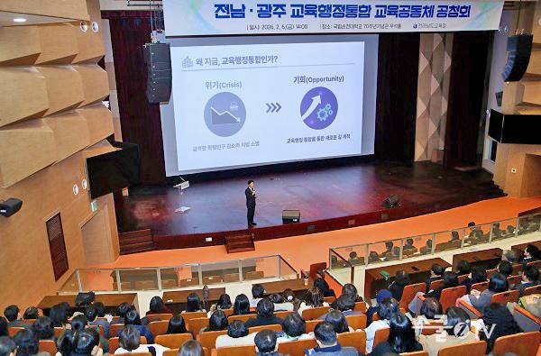 ±è ±³À°°¨Àº ¡°Àü³²¡¤±¤ÁÖ ±³À°ÇàÁ¤ÅëÇÕÀº ´Ü¼øÇÑ ÇàÁ¤ °áÇÕÀÌ ¾Æ´Ï¶ó Çлý ¼ºÀå°ú Áö¿ª ±³À°ÀÇ ¹Ì·¡¸¦ ÇÔ²² ¼³°èÇÏ´Â °úÁ¤¡±À̶ó¸ç, ¡°±³À°°øµ¿Ã¼ÀÇ ¸ñ¼Ò¸®¸¦ ÃæºÐÈ÷ ¹Ý¿µÇÏ¸ç ½ÅÁßÇÏ°Ô ³íÀǸ¦ À̾ »õ·Î¿î µµ¾àÀ» ÀÌ·ç°Ú´Ù¡±°í °Á¶Çß´Ù.