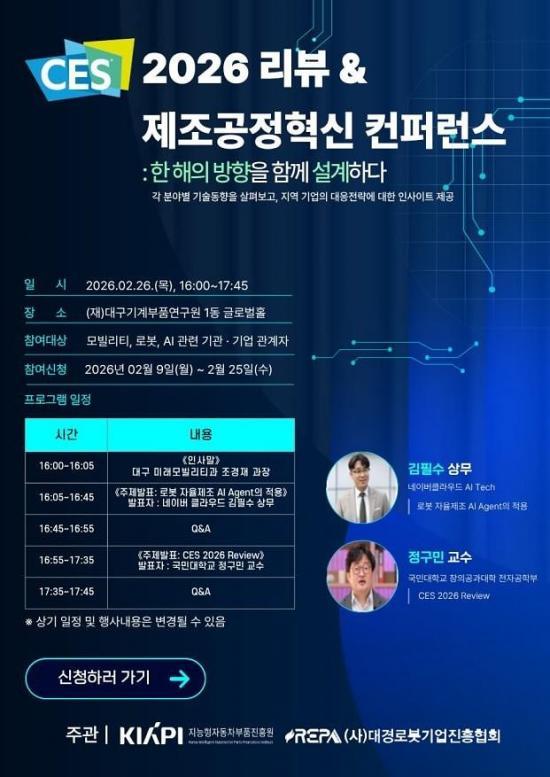 ´ë±¸½Ã´Â 26ÀÏ ¿ÀÈÄ 4½Ã ´ë±¸±â°èºÎǰ¿¬±¸¿ø ±Û·Î¹úȦ¿¡¼ ¡®CES 2026 ¸®ºä&Á¦Á¶°øÁ¤Çõ½Å ÄÁÆÛ·±½º¡¯¸¦ °³ÃÖÇÑ´Ù. À̹ø Çà»ç´Â Áö³ 1¿ù ¹Ì±¹ ¶ó½ºº£À̰Žº¿¡¼ ¿¸° CES 2026ÀÇ ÇÙ½É ±â¼ú µ¿ÇâÀ» Áö¿ª »ê¾÷°è¿Í °øÀ¯Çϰí, ÀΰøÁö´É(AI) ±â¹Ý Á¦Á¶°øÁ¤ Çõ½Å Àü·«À» ¸ð»öÇϱâ À§ÇØ ¸¶·ÃµÆ´Ù.
