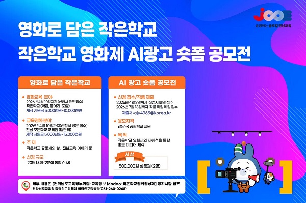 ¶ÇÇÑ Àü³²±³À°Ã»Àº ¡®2026. ÀÛÀºÇб³ ¿µÈÁ¦ AI ±¤°í ¼ôÆû °ø¸ðÀü¡¯À» ¿¾î, Àü³² ±¹¡¤°ø¸³Çб³ ±³¿øÀÌ 30ÃÊ ³»¿ÜÀÇ AI »ý¼º ±¤°í ¿µ»óÀ» Á¦ÀÛÇØ ¿µÈÁ¦¸¦ È«º¸Çϵµ·Ï ÇÑ´Ù. Âü¿©¸¦ ¿øÇÏ´Â Çб³¿Í ±³Á÷¿øÀº 4¿ù 10ÀϱîÁö °ø¹®À¸·Î ½Åû¼¸¦ Á¦ÃâÇØ¾ß ÇÑ´Ù.